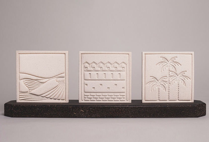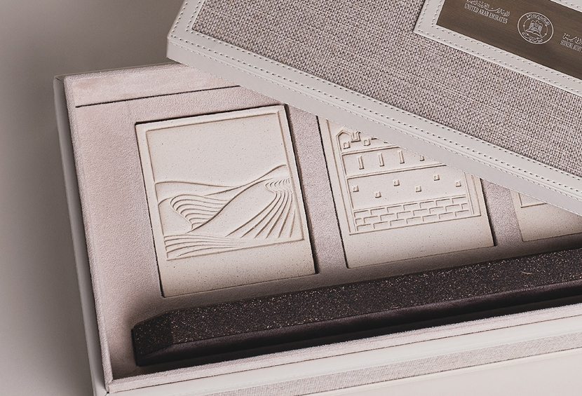 The gift comprises two elements: custom mementos made from traditional clay used by Emirati craftsmen, symbolizing the rich cultural heritage, while the sustainable solid surface base, crafted from date seeds sourced from UAE farms, reflects our deep cultural connection with the date palm.